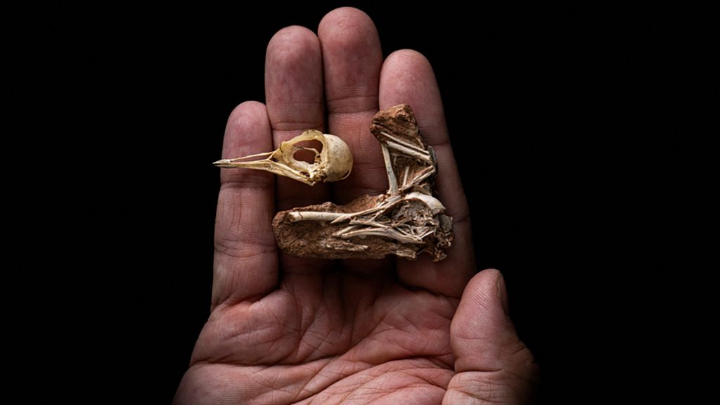 Photo of the skeletal remains of the starling-sized bird Navaornis hestiae, from Reuters.